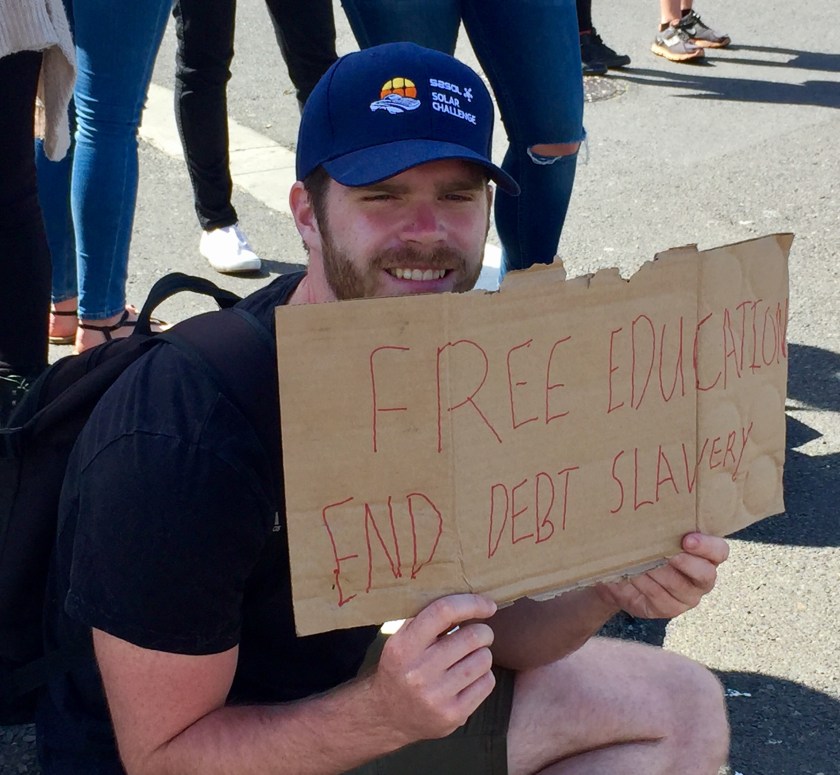 Previous Image Next Image file_001-3 A UCT student holds a sign which says “Free education. End debt slavery”. He was sitting outside of Parliament hoping to engage passers-by to further and deepen the debate on free education. PHOTO: Saarah Survé